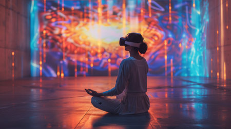 Person enjoying an immersive virtual reality experience with headphones and neon visuals, showcasing futuristic entertainment and digital innovation in a vibrant environment.