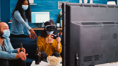 Woman playing video games using virtual reality headset wearing face mask during social pandemic to prevent illness with spending time with friends drinking beer. Multiethnic people hanging out