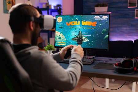 Gamer man winning space shooter game use virtual reality goggles. Competitive player using joystick for online championship sitting on gaming chair late at night playing on professional computer