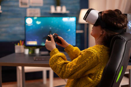 Pro cyber sport gamer relaxing playing video games using vr headset late night. Virtual shooter game championship in cyberspace, esports player performing on pc during gaming tournament.