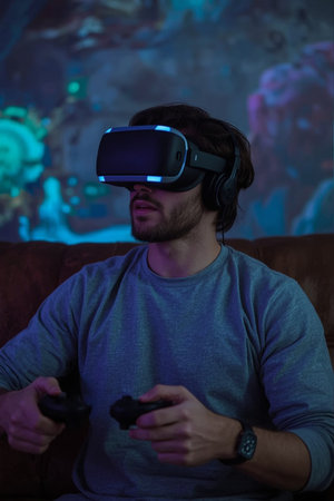 A seated gamer uses a cabled VR headset with a controller in a moody, purplish-blue environment. The scene highlights home-based immersive entertainment and modern technology integration.