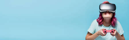 KYIV, UKRAINE - JULY 29, 2020: concentrated young woman with pink hair in vr headset playing video game with joystick isolated on blue, panoramic shot