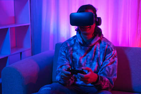 The guy is sitting in virtual reality. Neon retro style. The photo shows the effect of grain, noise.