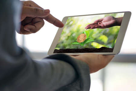 Hands holding a tree growing on coins Invest in stocks, save money, grow financially 3d illustration metaverse Virtual World