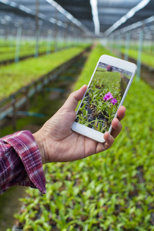 A hand using smart phone taking photo of purple orchid in orchid farm.