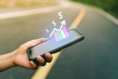 Market stock graph icon screen of smartphone background. Financial business technology freedom dream life using internet freedom life concept.