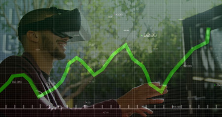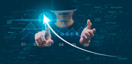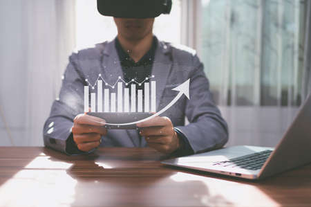 Man wearing VR glasses virtual touch arrow of Investment finance chart stock market business and financial growth graph,Business strategy development and growing growth plan, growth graph Technology.