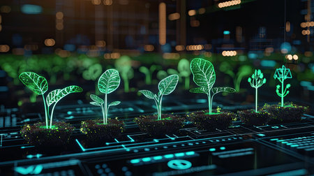 This visually striking image showcases a thriving green plant integrated into a futuristic, tech-driven environment. It represents the intersection of nature, sustainability, and cutting-edge