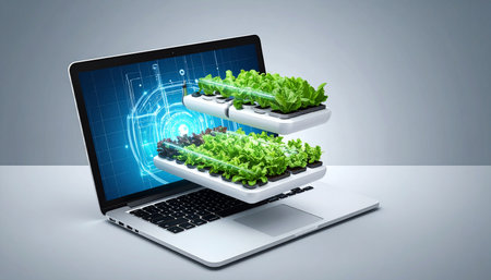 A laptop displays a holographic interface, showcasing the future of agriculture.