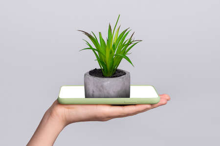 Picture of arm holding little green fresh flower in pot growing out of smartphone telephone touch screen display modern futuristic holographic web opportunities
