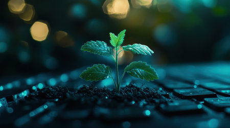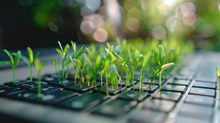 A laptop keyboard with a tiny plant embodies Digital Sustainability and Green IT, promoting environmental consciousness in technology Explore eco-friendly solutions, sustainable computing, and responsible digital practices This image symbolizes integrating nature and technology for a greener future, inspiring reduced digital footprints and eco-conscious strategies AI Generative