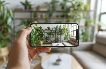 A person using a smartphone to browse plant images in a vibrant indoor garden, showcasing modern technology and nature.