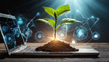 A hands-on approach to blending nature and technology, showcasing a plant growing from soil with data visuals indicating growth and progress.