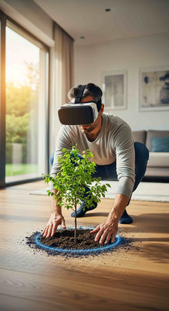 Young man wearing virtual reality goggles and planting a tree in the living room
