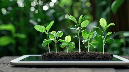 A fresh display of green seedlings growing on a tablet, blending technology with nature. The vibrant leaves emerge from soil, symbolizing innovation and sustainability.
