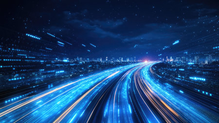 Digital data flow on road with motion blur to create vision of fast speed transfer . Concept of future digital transformation , disruptive innovation and agile business methodology .