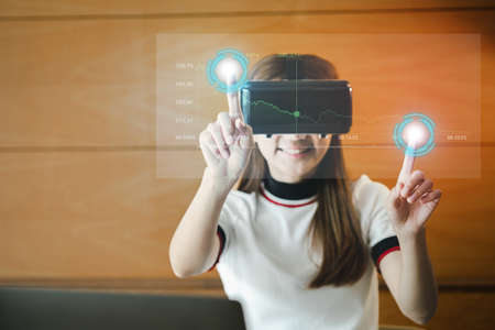 Woman wearing virtual reality glasses to use the technology of the future, using virtual reality technology to facilitate and enjoy leisure, boundless imagination, Smartphone using with VR headset.