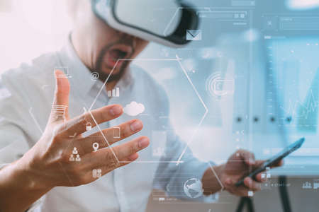 businessman wearing virtual reality goggles in modern office with mobile phone using with VR headset with screen icon diagram