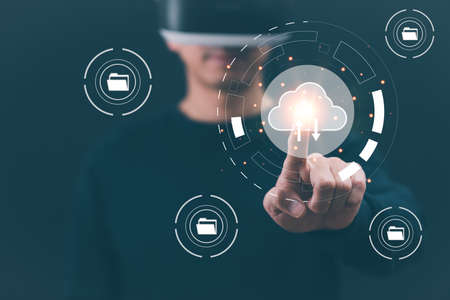 Man wearing VR glasses virtual Global Internet connection metaverse networking, sharing download and upload,online documentation database and process automation to efficiently manage files technology.