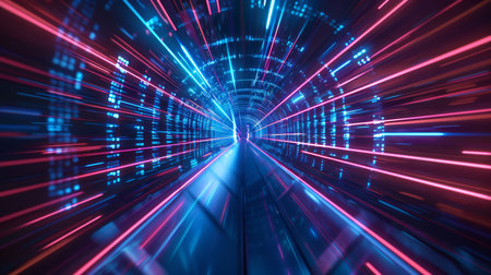 High-Speed Data Tunnels - A futuristic tunnel illuminated by streaks of neon blue and red light, representing the rapid movement