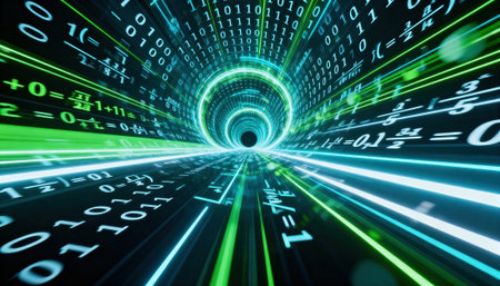 Data tunnel accelerates through glowing streams of binary and mathematical symbols with neon green and cyan light trails imparting sense of speed, connectivity and virtual transport in a futuristic digital network