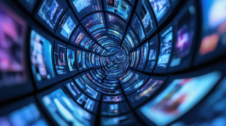 Screens displaying diverse content swirl in a vortex, forming a dynamic, futuristic digital realm with vibrant blues and purples.