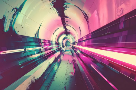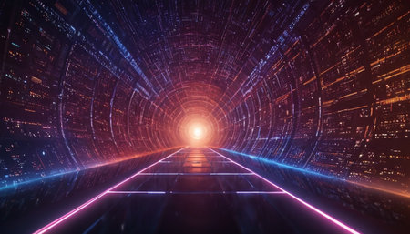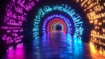 Neonlit tunnel with swirling digital patterns, futuristic and vibrant