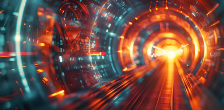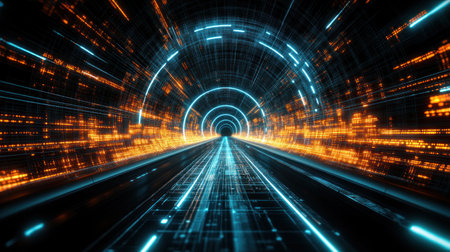 An abstract representation of a tunnel filled with swirling trails of vibrant blue and orange light. The streaks of light create a sense of immense speed and motion, the viewer into a futuristic...