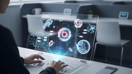 Hands are typing on a transparent laptop, with holographic scientific data featuring biological...