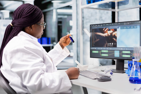 Black female researcher studying compound in jar for a laboratory experiment, biochemistry and genetics. Scientific work reflects innovation, medical discovery and advanced research.