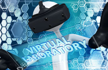 Science technician in virtual reality glasses examines the drug in laboratory.