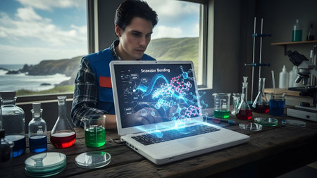 Researcher showing young researcher studying seawater bonding with molecular visualization on a...