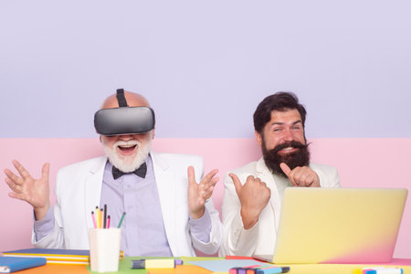 Virtual reality in office. Businessman team work. Office coworkers. Business people senior old young. Businessmen working together in team.