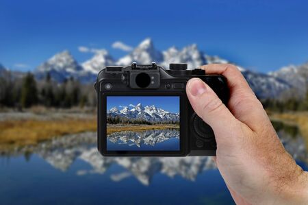 The person holding a blurred camera with the snowy mountains in focus in the background