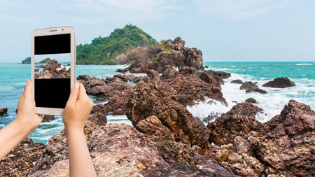 Take a mobile picture on your phone seashore. Female hands hold the phone and take pictures. Travel photography.