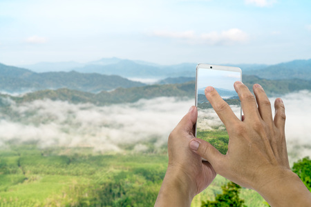 smart phone with taking pictures the landscape on mountain and Mist at Khao Kho Phetchabun Thailand