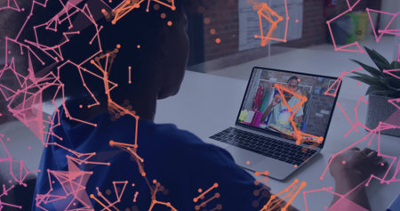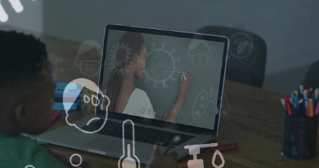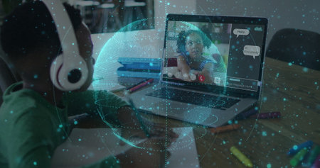 Image of data processing over african american boy doing homework and having imagecall on laptop. Distant learning online education concept