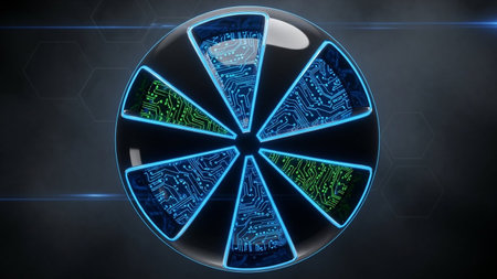 Digital background image with pie chart against blue and orange 3d artwork, Generative AI illustrations.