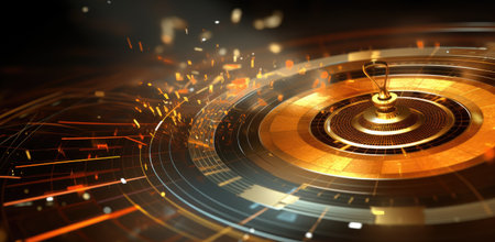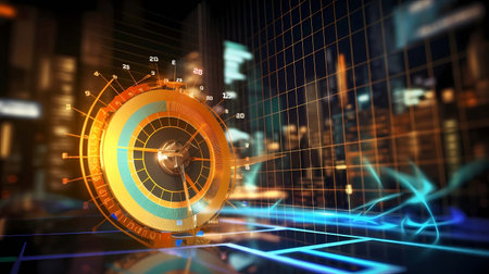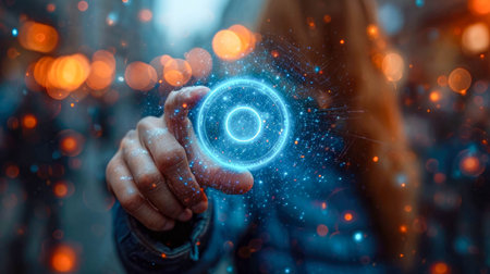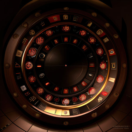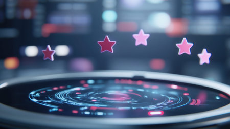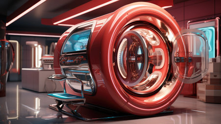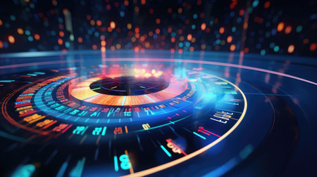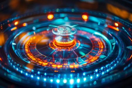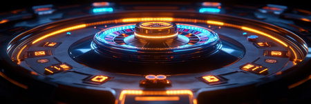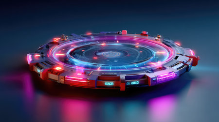 This image showcases a futuristic circular interface, illuminated with vibrant neon lights and high-tech details, perfect for sci-fi and digital art projects.