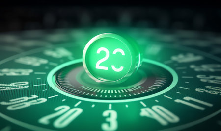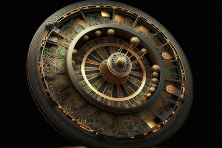 A golden clock with seven different colored numbers on it. Generative AI image.