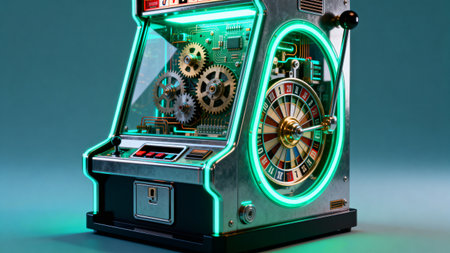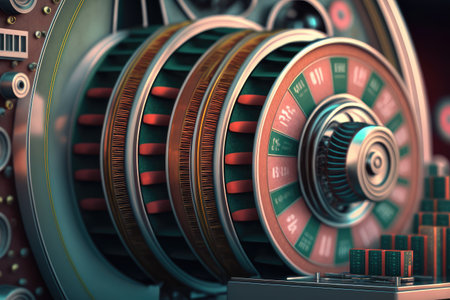 close-up of slot machine wheels, with coins and cards visible, created with generative ai