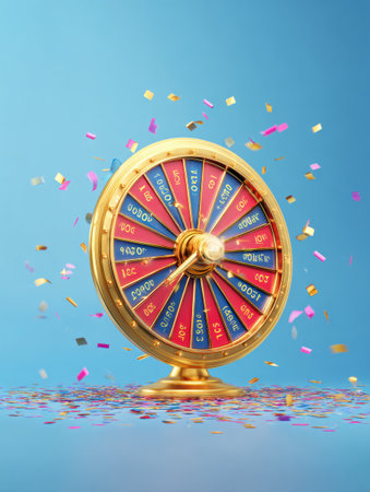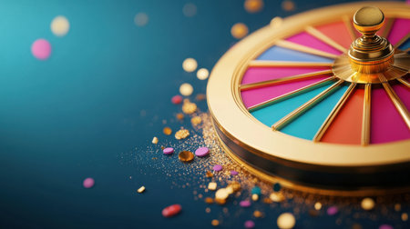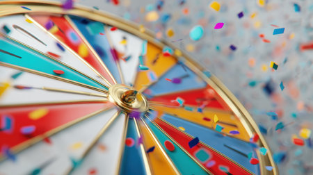 A vibrant fortune wheel spins with confetti, creating an exciting atmosphere of anticipation in a festive moment.