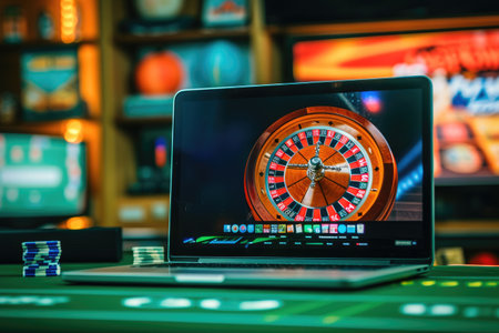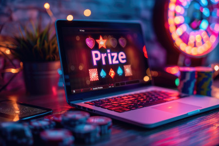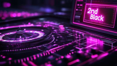 Colorful neon numbers light up the roulette table, enhancing the thrilling atmosphere of a bustling casino during the night.