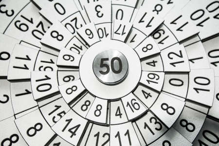 A colorful pie chart with numbers 0 through 9 on it. The pie chart is made of different colored plastic pieces