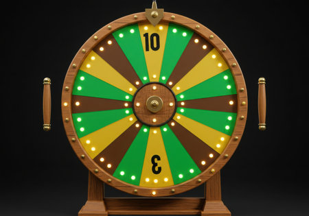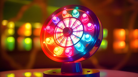 A wooden prize wheel with colorful segments, illuminated lights, and numbers, mounted on a stand, ready for a game.