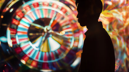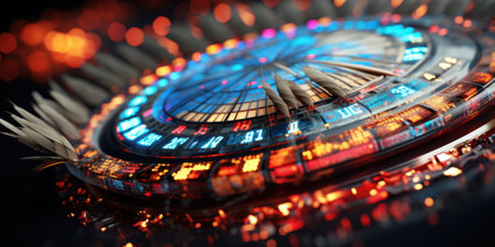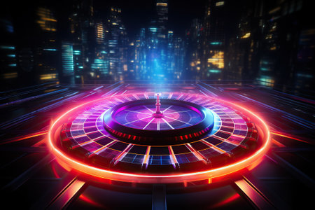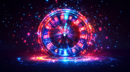 A bright, neon-lit roulette wheel glowing with vibrant colors, symbolizing the thrill and excitement of high-stakes casino games.