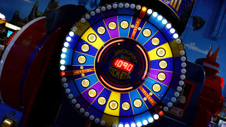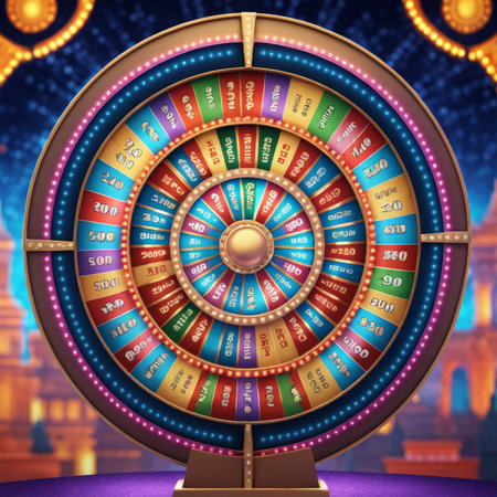 Lottery game wheel, bright color palette, spinning chance, highstakes feel