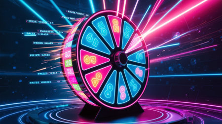 Illuminated spinning wheel rendered in neon colors against dark background with digital effects and prize indicators. Casino gaming, lottery promotions, or entertainment advertising.