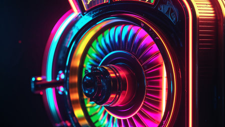 Futuristic, colorful turbine spinning with neon lights, creating a vibrant and dynamic scene in a dark environment. Ai generated image