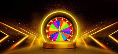Colorful casino spinning wheel above golden circular podium with bright neon laser arrows and glowing rings on dark background. Gambling promotions, lottery announcements or game show concepts.